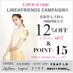 延長決定!LINE@FRIENDS CAMPAIGN♪7000円以上で12%OFF&ポイント15倍還元!SNIDEL.CELFORD,FRAY IDなど予約も♪