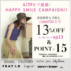 HAPPY SMILE CAMPAIGN♪7000円以上で13%OFF&いつもはポイント10倍のところ…なんと15倍!新作も予約も対象★