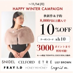 【 HAPPY AUTUMN CAMPAIGN スタート】SNIDEL,FRAY I.Dなど秋冬新作&予約も 8000円以上で ★ 10%OFF&3000ポイントまで利用可能 ★