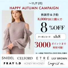【 HAPPY AUTUMN CAMPAIGN 】SNIDEL,FRAY I.Dなど秋冬新作&予約も 8000円以上で ★ 8%OFF&3000ポイントまで利用可能 ★~11/7(月)