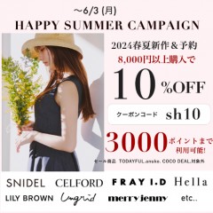 【 HAPPY SUMMER CAMPAIGN START 】人気ブランドの 春夏新作 & 予約 が 8,000円以上購入で ★ 10%OFF&さらに3000ポイントまで利用可能 ★~6/3(月)