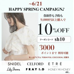【 HAPPY SPRING CAMPAIGN スタート】今回は3000ポイントまで利用可能!!さらに10%OFF!人気ブランドの新作、予約アイテムがお得♪