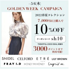 GWも毎日配送!!【 GOLDEN WEEK CAMPAIGN スタート 】2022 春夏コレクションが7,000円以上のお買い物で10%OFF!!★さらに3000ポイントご利用可能★