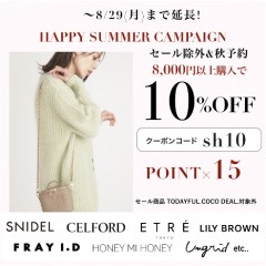 延長決定!!【 HAPPY SUMMER CAMPAIGN 】人気ブランドの秋新作&予約が8000円以上購入で★10%OFF&3000ポイントまで利用可能★~7/24(月)