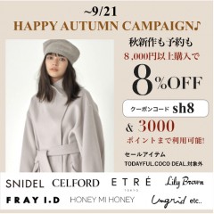 9/21まで延長!!【 HAPPY AUTUMN CAMPAUGN 】人気ブランドの秋新作や予約が8000円以上で8%OFF♪さらに3000ポイントまで使えてお得に◎