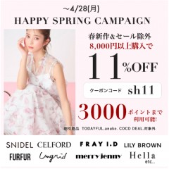 【HAPPY SPRING CAMPAIGN スタート】人気ブランドの 春新作 & セール除外 が8,000円以上購入で ★11%OFF&さらに3000ポイントまで利用可能★