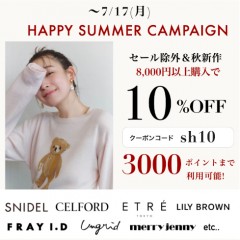 【 HAPPY SUMMER CAMPAIGN 】人気ブランドの新作&予約が8000円以上購入で★10%OFF&3000ポイントまで利用可能★~7/17(月)