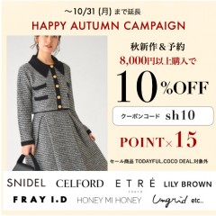 延長中!!【 HAPPY AUTUMN CAMPAIGN 】SNIDEL,FRAY I.Dなど秋冬新作&予約も 8000円以上で ★ 10%OFF&ポイント15倍 ★~10/31(月)