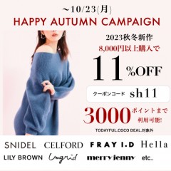 【 HAPPY AUTUMN CAMPAIGN START 】人気ブランドの秋新作&予約が8000円以上購入で★11%OFF&さらに3000ポイントまで利用可能★~10/23(月)