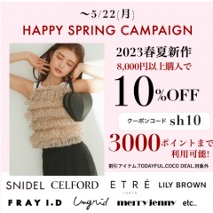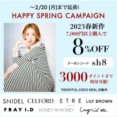 延長決定【 HAPPY SPRING CAMPAIGN 】SNIDEL,FRAY I.D,ETRE TOKYOなど春夏新作&予約も ★ 7,00円以上購入で8%OFF&さらに3000ポイント利用可能 ★