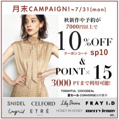 今だけ3000PTまで利用可能♪月末キャンペーンスタート!!7000円以上で10%OFF&ポイント15倍★秋冬予約も新作も対象♪
