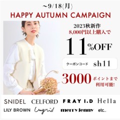 【 HAPPY AUTUMN CAMPAIGN START 】人気ブランドの秋新作&予約が8000円以上購入で★ 11%OFF&さらに3000ポイントまで利用可能 ★~9/18(月)
