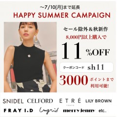 延長決定!!【 HAPPY SUMMER CAMPAIGN 】人気ブランドの新作&予約が8000円以上購入で☆ 11%OFF&3000ポイントまで利用可能 ☆
