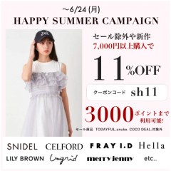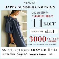 【 HAPPY SUMMER CAMPAIGN START 】人気ブランドの 春夏新作 & 予約 が 7,000円以上購入で ★ 11%OFF&さらに3000ポイントまで利用可能 ★~6/24(月)