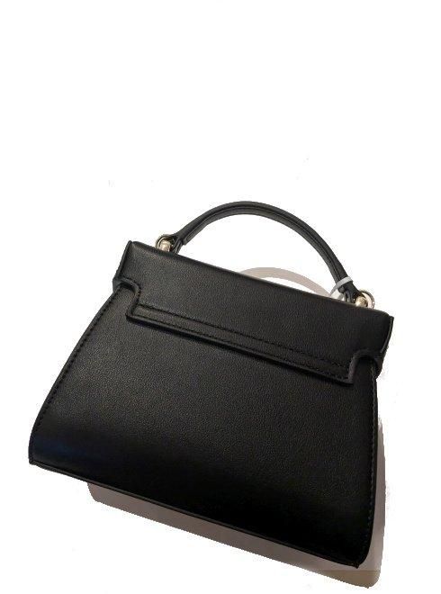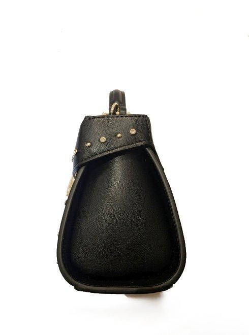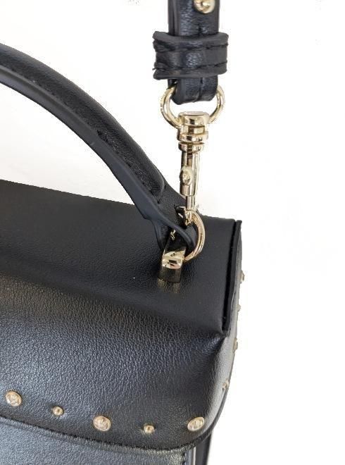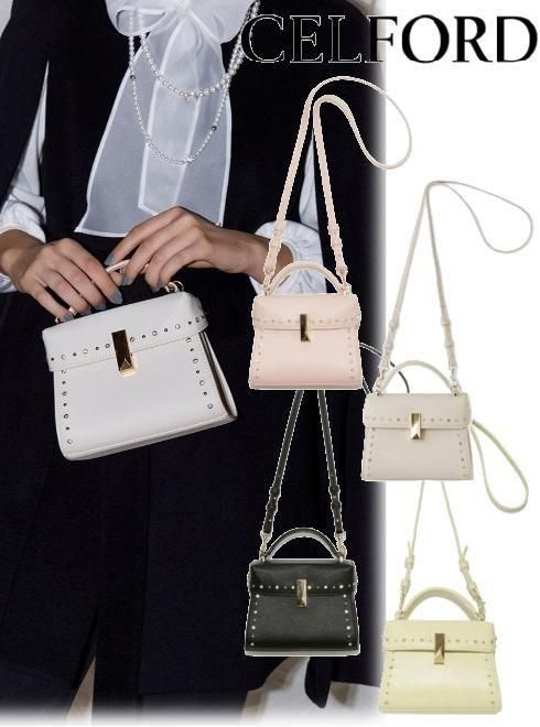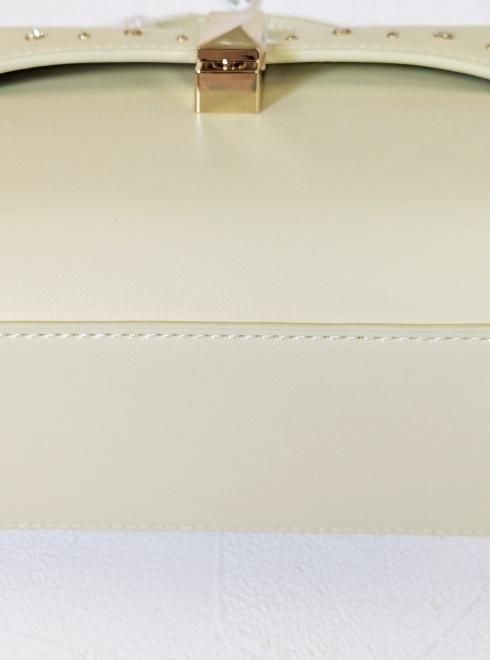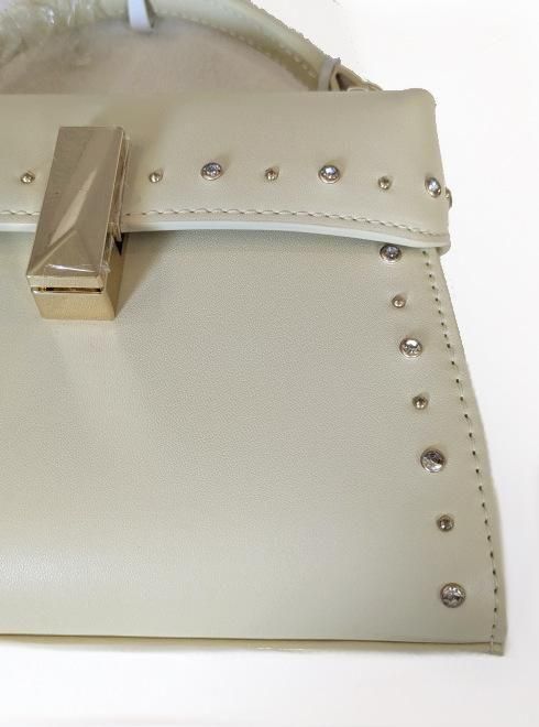 ハードな印象のスタッズモチーフですが、ビジューと交互に配置することで程よく甘さを演出し、バッグ自体を小ぶりで自立する形に仕立てて上品にまとめました。