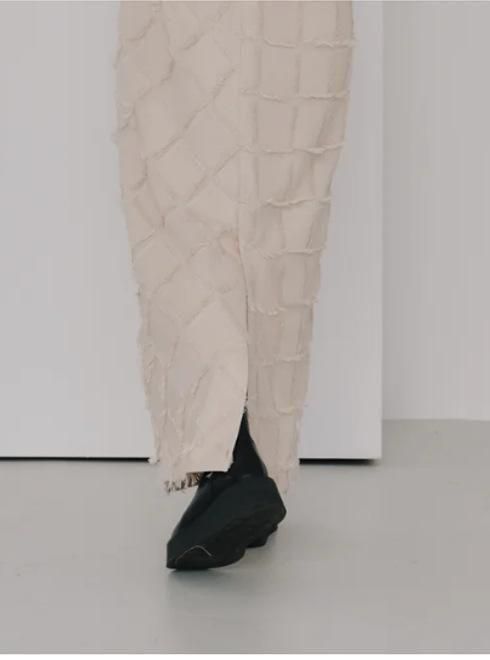 緻密に配置された生地の切り替えが、シンプルなフォルムの中に動きを生み出し、洗練された印象を演出します。