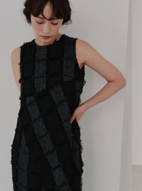 大判のチェックのカットジャガード生地を使用したペンシルシルエットドレス。