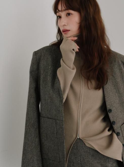 ボディラインに程よくフィットするジップアップリブニット。