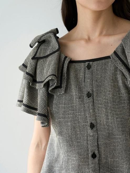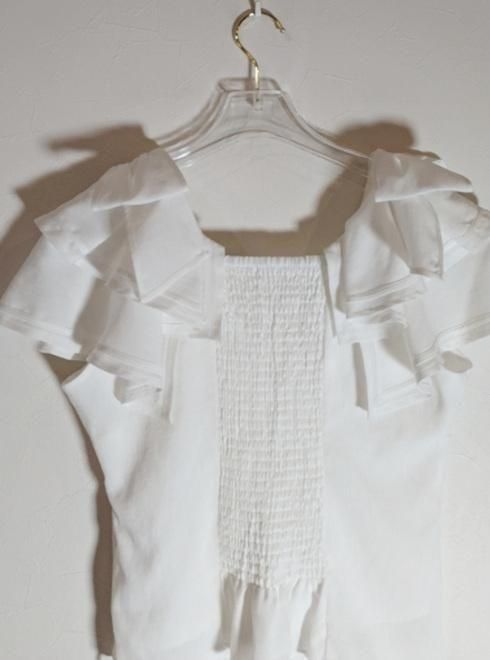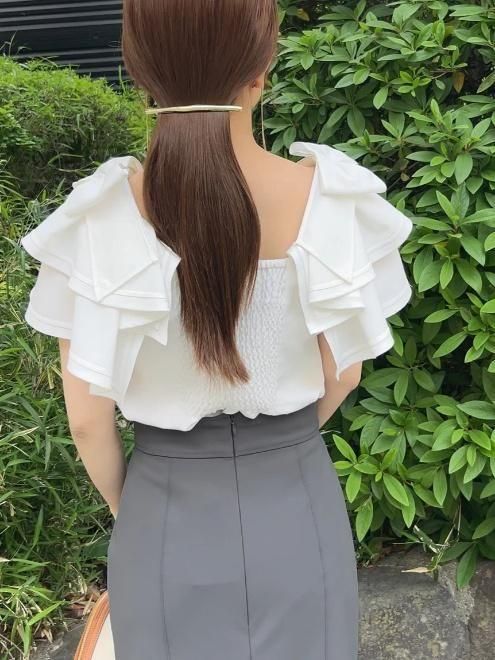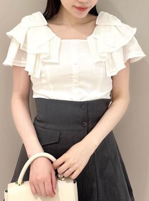 スカーフで形作ったような袖の立体フリルや肩上のリボンが目を惹く1枚で主役級のブラウスです。肩から二の腕にかけて大胆に配置された二段フリルは、華奢見え効果抜群。