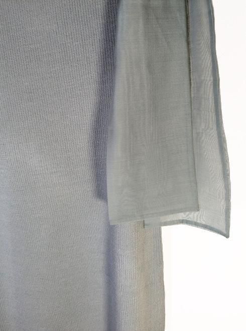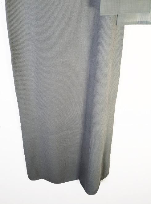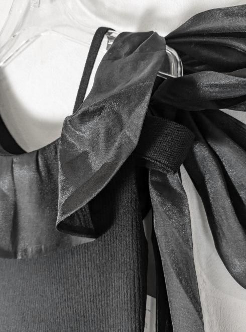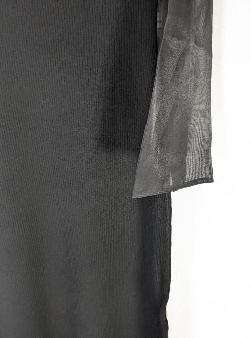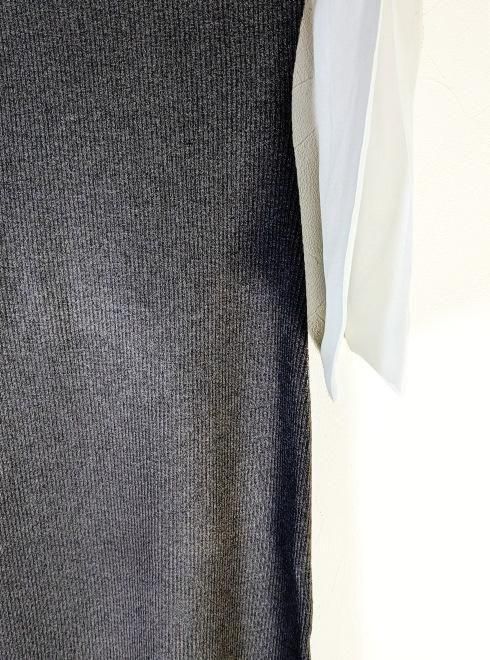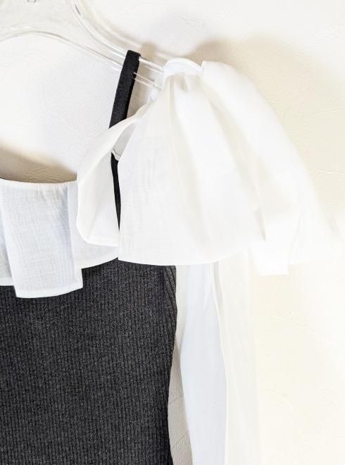 ボディラインに優しく寄り添うタイトシルエットのワンショルダーリブニットワンピースに、艶感の美しいオーガンジー襟をドッキングさせたドラマティックなワンピースが到着。