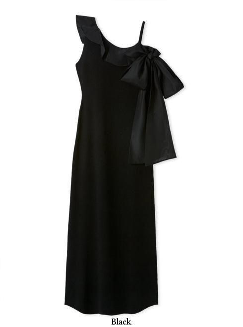 大きく開いた襟ぐりの左肩は襟から続く長めのオーガンジーリボンを施して、顔まわりを華やかにふんわりと仕上げました。上品な女性らしさを際立たせながら、スタイルアップ効果も抜群なワンピースです。