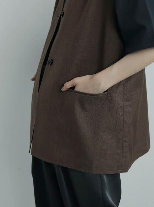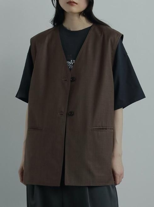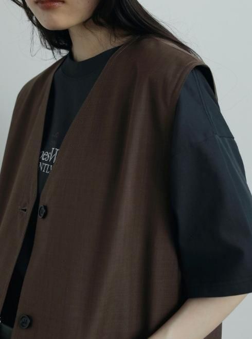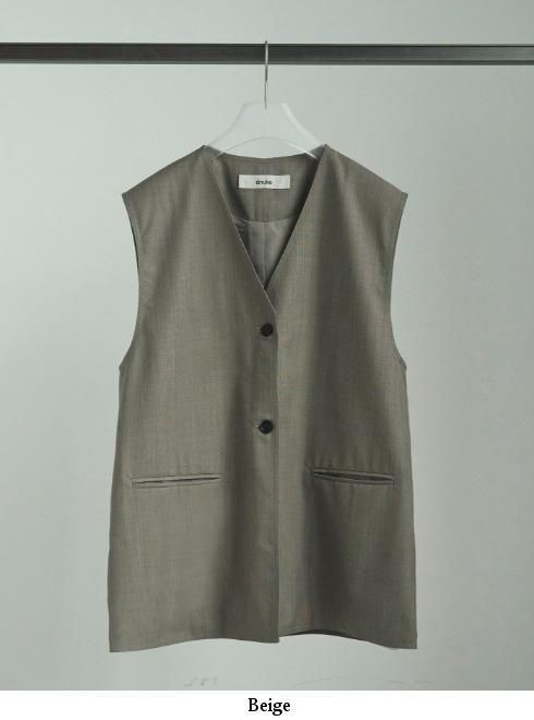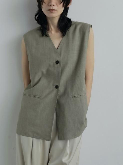 程良くゆるめのシルエスッキリでミニマルなデザインで仕上げたVネックベスト。サラッとした風合いのウール混の杢調素材で、大人っぽく着ていただける一枚です。