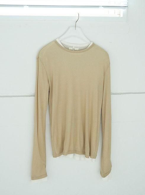 薄手の透け感のあるリブ素材を使用したロングTシャツ。カラーの異なる2枚をレイヤードしたセットアイテムです。