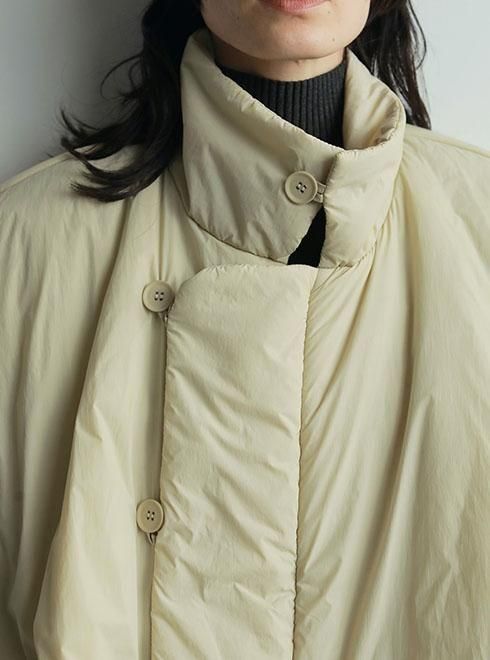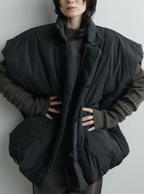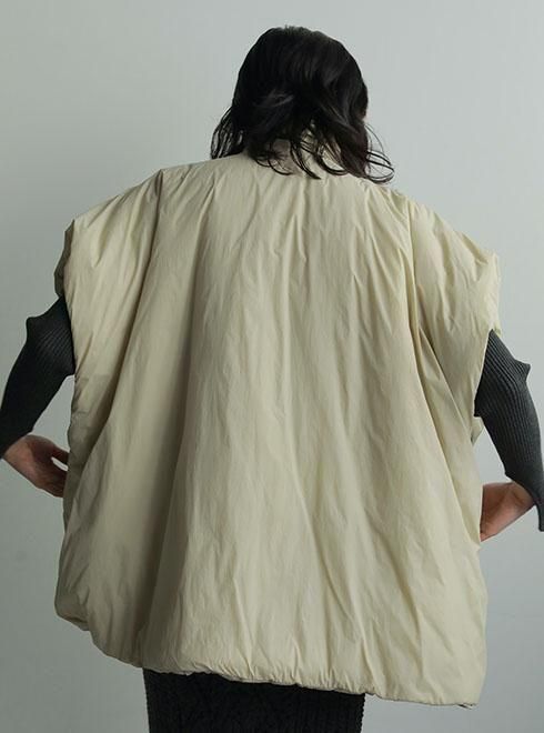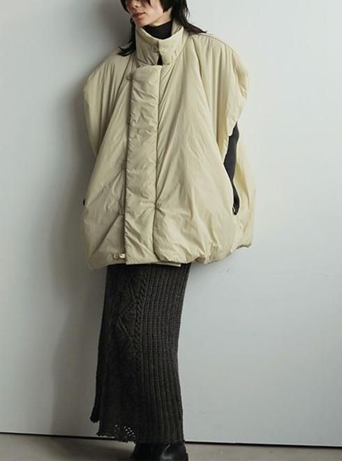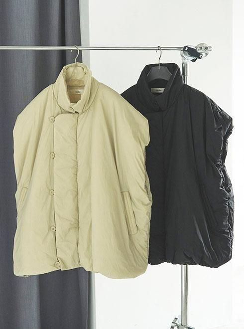 ふっくらと丸みのあるオーバーなシルエットが可愛い中綿ベスト。太巾の前立てとボタンディテールもポイント。裾はゴムコード入りで、お好みのバランスに調節していただけます。