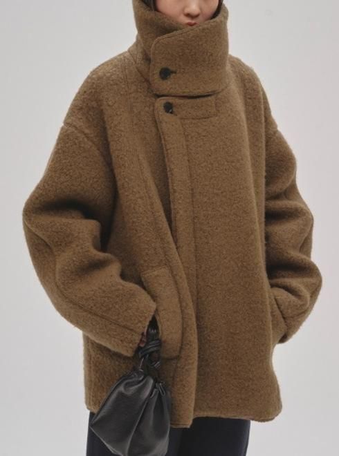 顔まわりを包み込むスタンドカラーは、折り返して大きな襟としても着用可能。気分やスタイリングに合わせてアレンジできる、着回し力の高い一枚です。