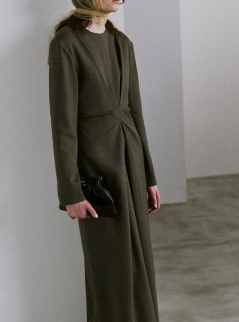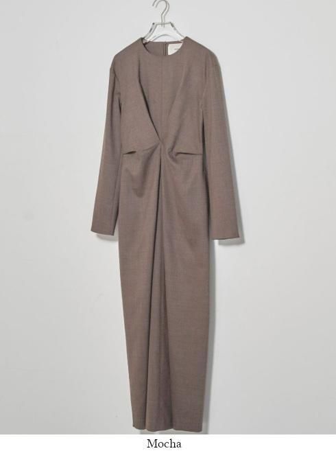 ウール混の二重織生地を使用したドレス。ウエストに寄せたタックが自然な立体感をつくり、体のラインを綺麗に見せてくれます。