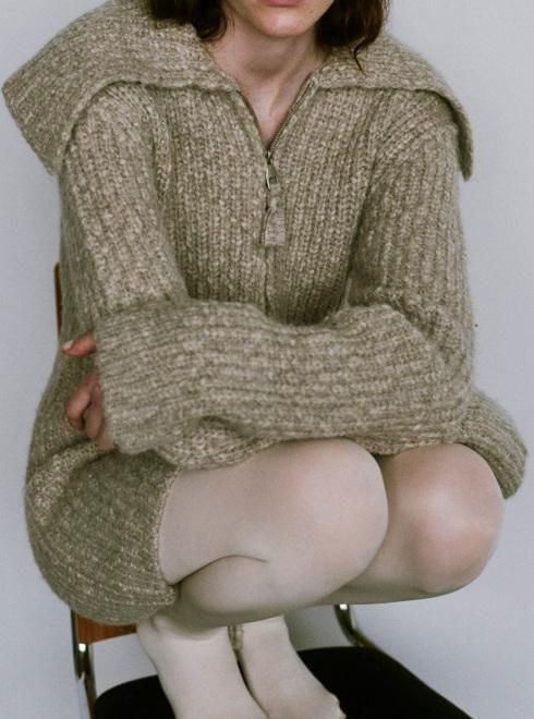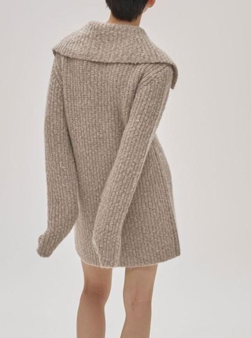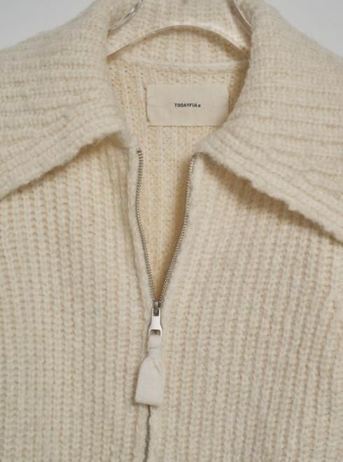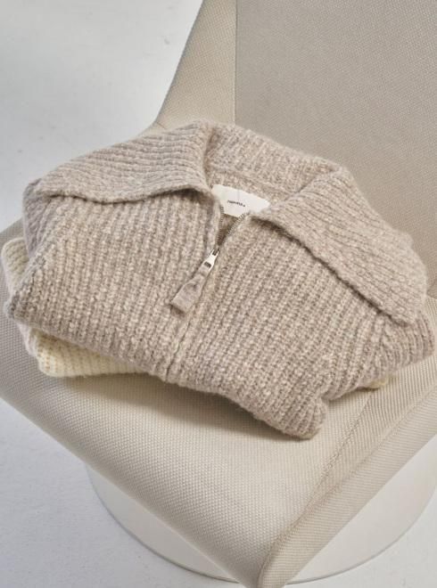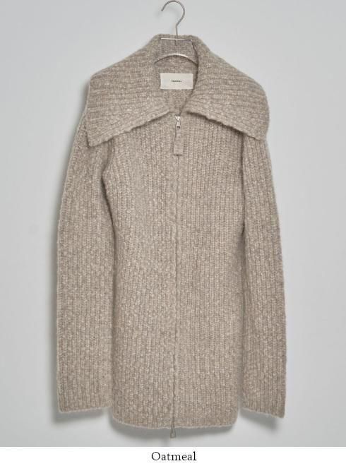 異なる2種類の糸を組み合わせて編み上げたニットカーディガン。同じ糸で編み上げたファスナーの引き手や、存在感のある大きめの襟が特徴です。