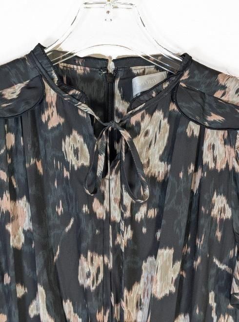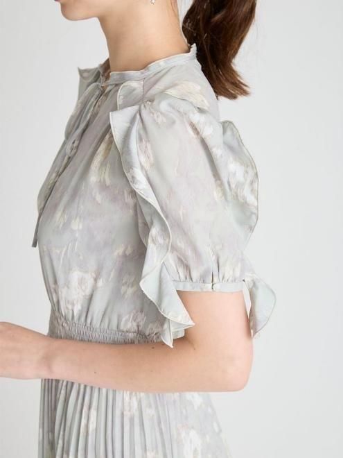 程よいプリーツ分量と動くたびに映える袖のフリルが素敵なプリントワンピースです。