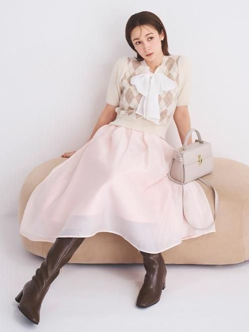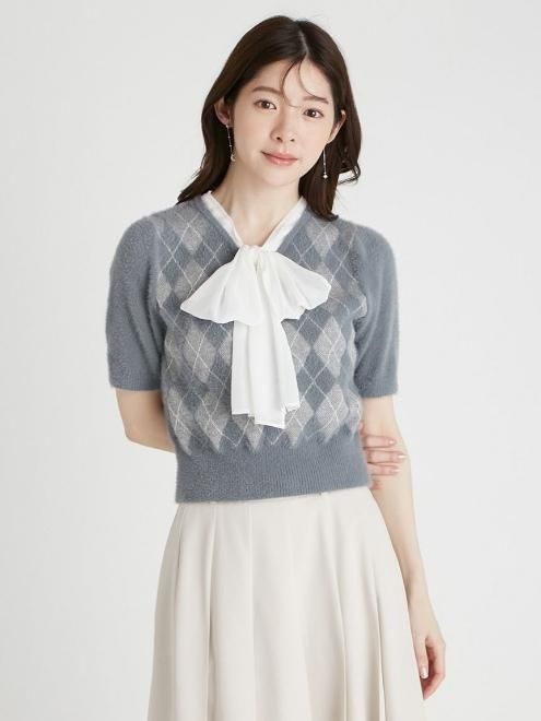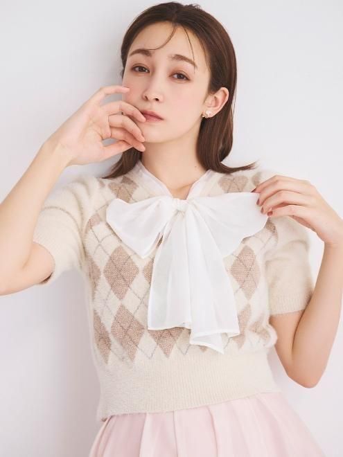 アーガイル柄がトラッドな気分を引き立てる、ボウタイリボンニットプルオーバー。