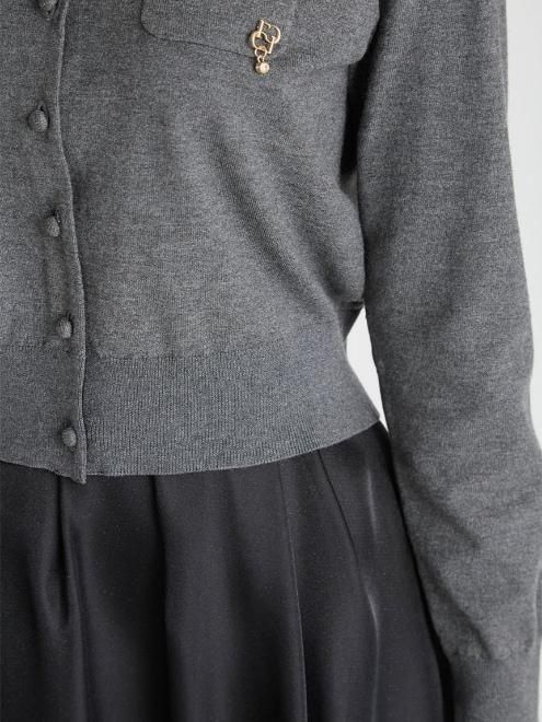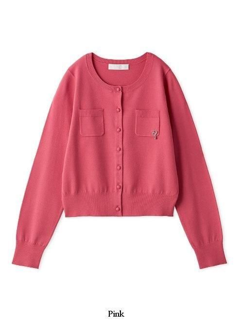 胸元で光るオリジナルロゴパーツと揺れるビジューチャームがキャッチーなカーディガン。