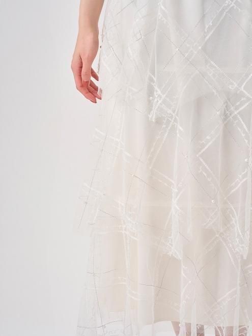 チュールのに三角モチーフラインとリボン糸とラメ糸の3種類でチェックを刺繍しています。