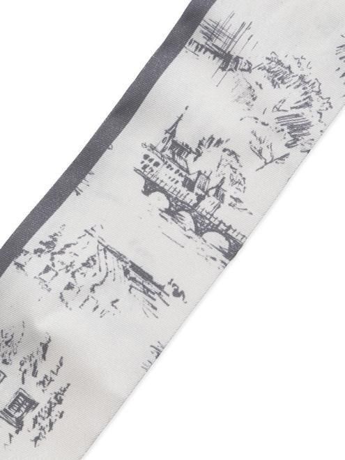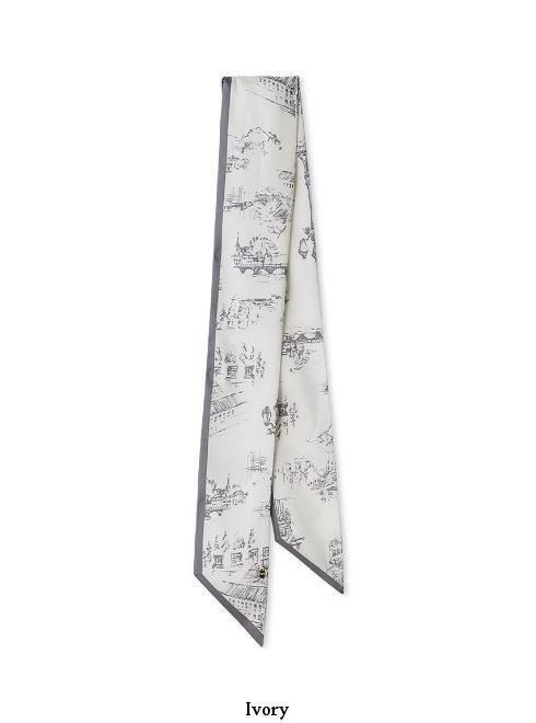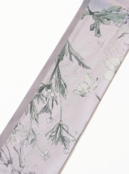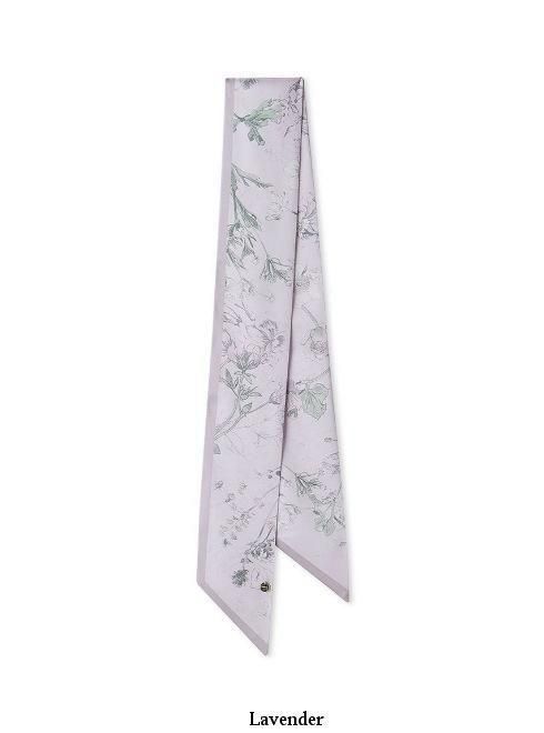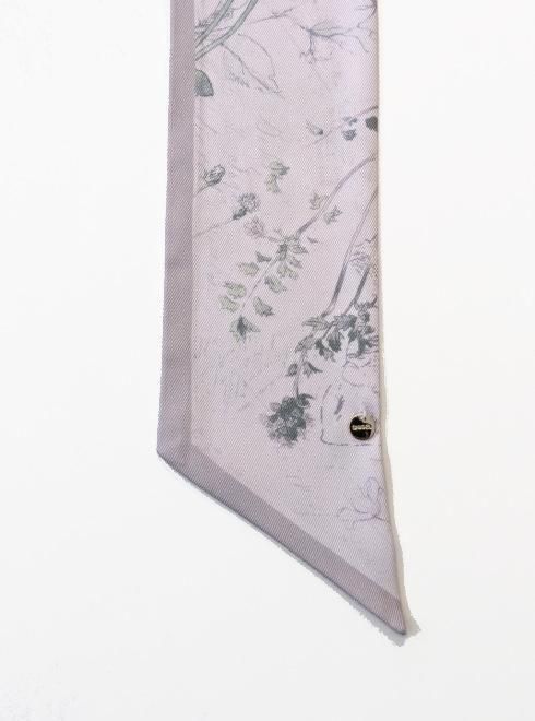 SNIDELオリジナル柄でお作りした、洗練された女性らしさを引き立てるタイスカーフがお目見え。艶感のある柔らかな生地を使用。アイボリーはグレータッチの風景柄、淡いラベンダーカラーはボタニカル柄で線画タッチのロマンティックな印象に仕上げました。