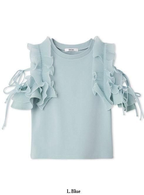 昨年も人気だったプリーツフリルカットプルオーバーがブラッシュアップで今年も登場します。SNIDEL定番人気の上品華やかなプリーツフリルを、着心地の良いノースリカットソーにドッキングしたアイテムです。