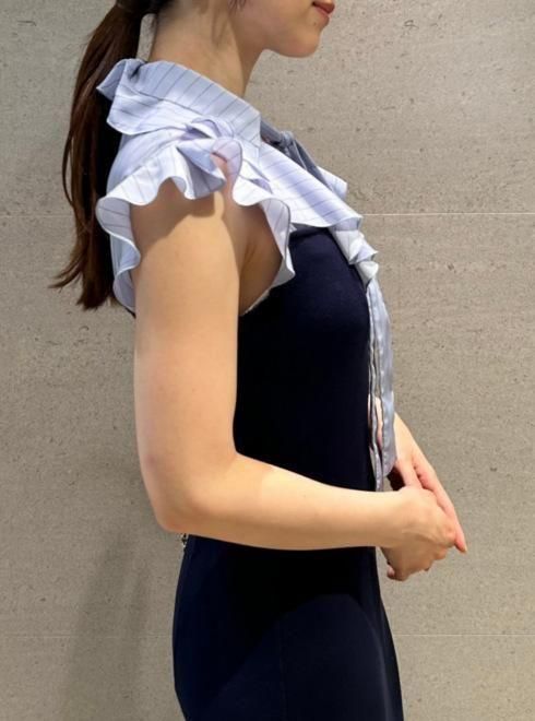 まだ暑い時期からも着られる、クラシカルなディティールを詰め込んだノースリワンピースです。ドッキングしたボディ部分のニットは滑らかで肌あたりの良い素材感、エコレーヨン使用しており、フィット感がありながら肉感はカバー。