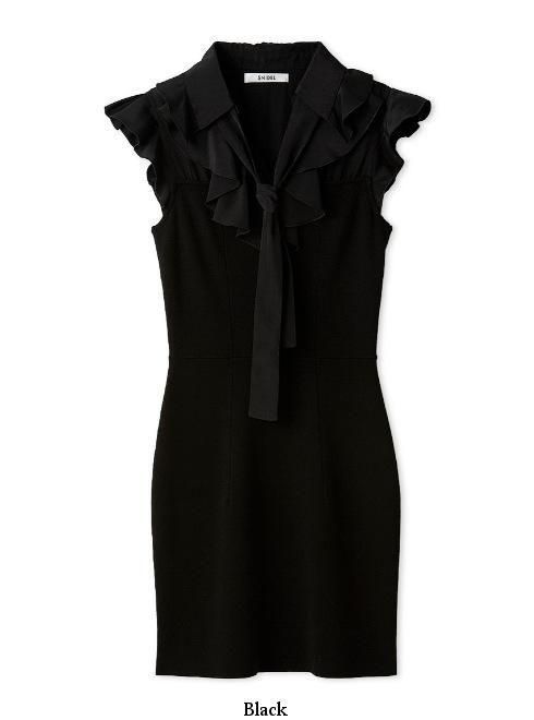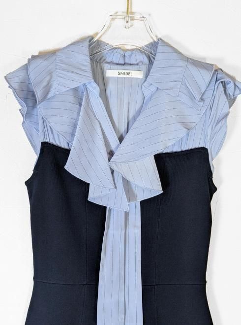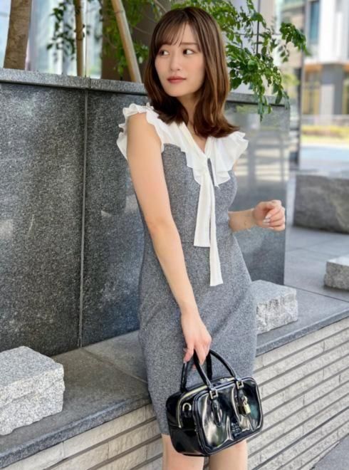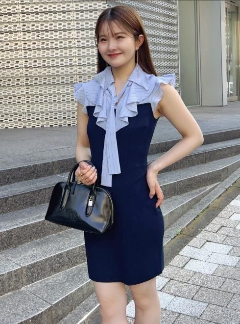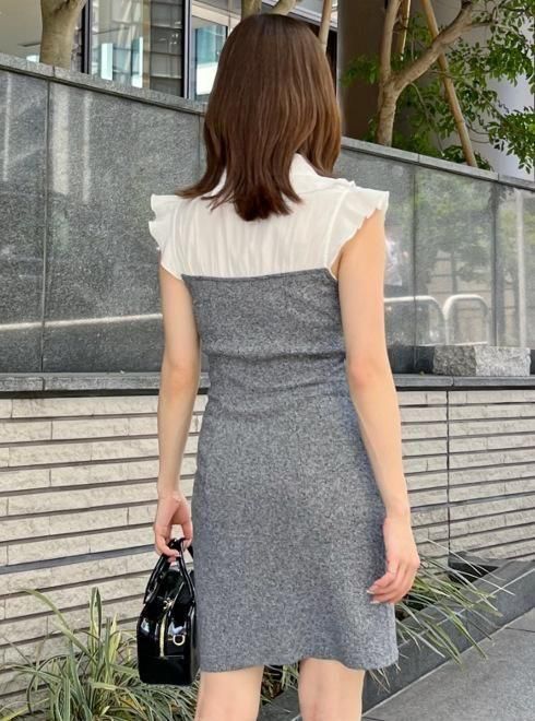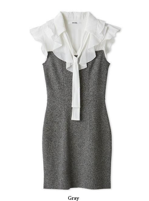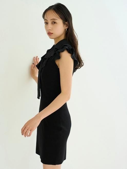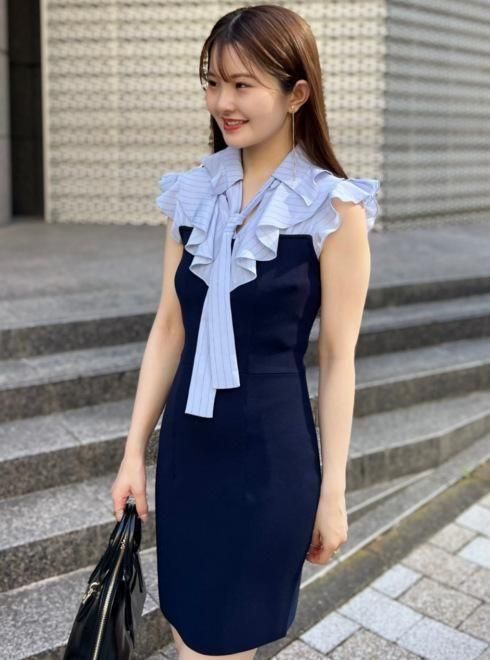 柔らかでツヤ感のある素材のボウタイブラウスをドッキングしたミニニットワンピ。すっきりとしたV開きブラウスの胸元に配置した、フリル襟とボウタイの組み合わせが顔まわりを華やかに演出します。