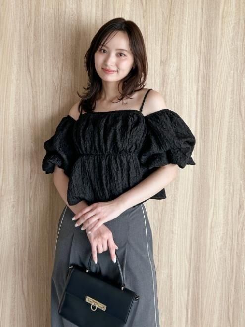 艶感とシワ感のような表面感のあるジャガード生地でお作りしたSNIDEL人気のオフショルフリルブラウスです。バスト部分はギャザーでふっくらとさせつつもサイドをタイトに仕上げることで、メリハリのあるペプラムデザインに。裾はふんわりとしたペプラムシルエットで美脚効果も期待できます。