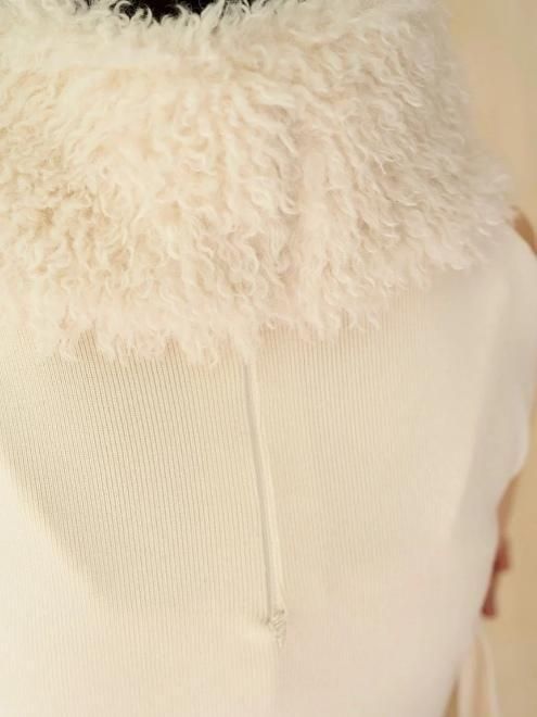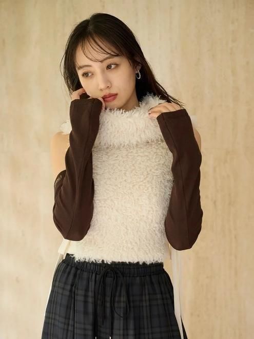 前身頃とハイネック襟部分に施されたボリューミーなファーがふんわり華やかなアメスリニットトップスがお目見え。ハイネックデザインながらも、少しゆったりとした襟元と人気のアメスリデザインで抜け感をプラスしました。