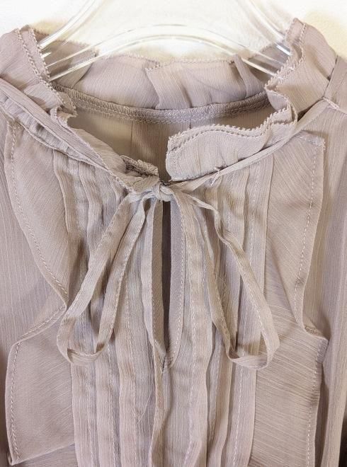 ワンピースにはギャザーやピンタックをふんだんに取り入れ、柔らかな素材に動きが出るようにこだわってお作りしています。スタンドカラーと細目のボウタイできちんと感をプラス。