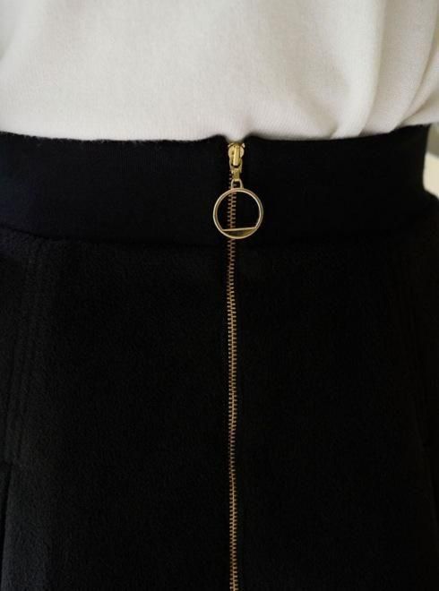 ふっくらとした肉厚な生地でお作りした立体感のあるプリーツミニスカートです。温かみのある毛足のある生地で秋冬気分を先取りできるアイテムです。ウエストベルト位置のサイドはリブ編みに切り替えてフィット感を加え、背中側にゴールドジップデザインを加えて少しモードなディティールをプラスしました。