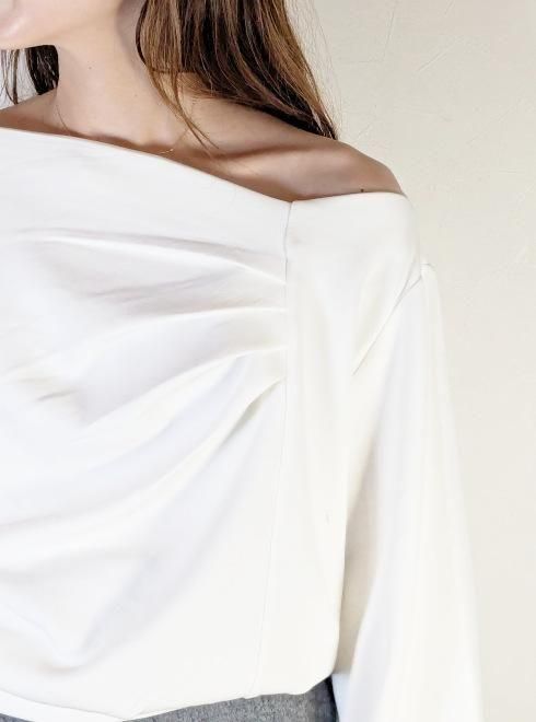 胸元にアシンメトリーでタックディテールを加えてエレガントに仕上げた、カットソー素材のトップスが到着。左肩を落とし、ワンショルダーとしての着用も可能な2WAYです。リラクシーに着られるゆったりとしたサイズ感ですが、落ち感のある柔らかい素材を使用しているので、着ぶくれして見えないのもポイント。