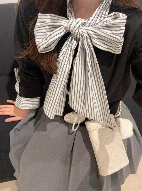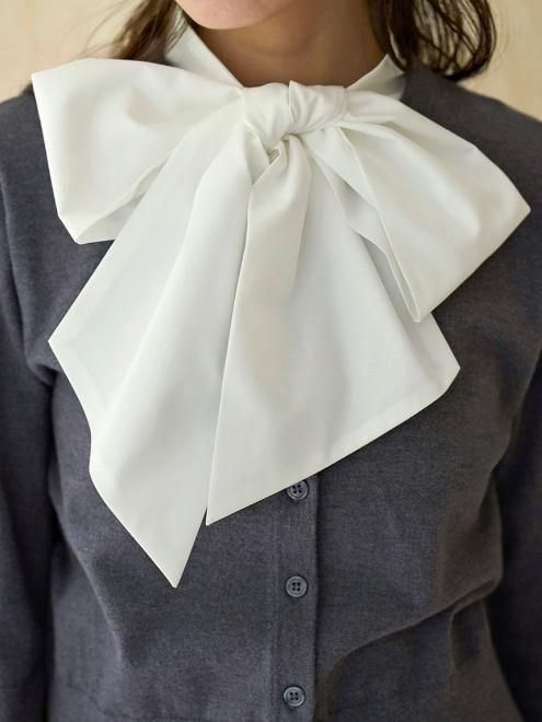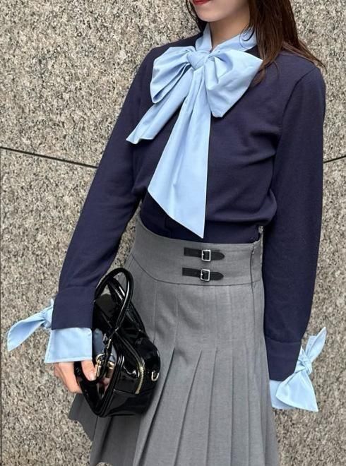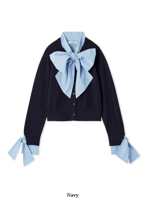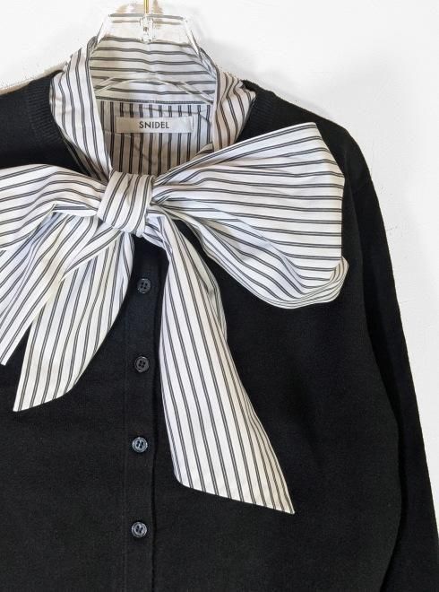 胸元にシャツ地のゴージャスなボウタイリボンを、袖口にもシャツのリボン付きカフスをドッキングした華やかなニットプルオーバーが届きました。