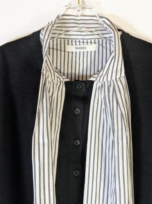 ボウタイシャツとボタン付きのニットカーディガンを重ね着したようなドッキングデザインで、もたつかずにスッキリと着られる1着です。