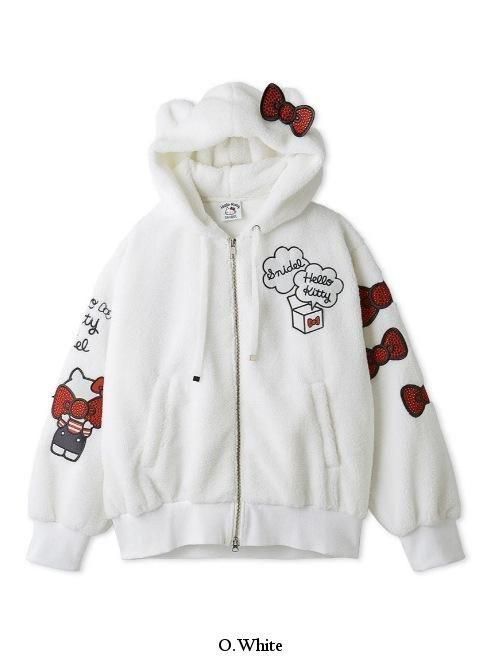 袖やフードにあしらったハローキティのリボン部分にはキラキラとしたランストーンもあしらいリュクスな印象です。背中側にもサガラ刺繍を施し、360度かわいいアイテムに。