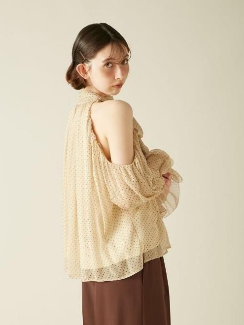繊細な楊柳シフォンにギャザーをたっぷりと寄せた、軽やかで華やかなブラウス。肩まわりはあえてヘルシーな肌見せ仕様にし、スッキリとした印象に仕上げています。サイドから見た二の腕のラインも美しく見えるよう、肩の開きはほんのりVラインに設計。ハイネック部分にもギャザーを施し、着るだけでこなれたムードを演出します。衿のリボンは前でも後ろでも結べる2WAY仕様で、気分に合わせて印象チェンジが可能。前後差のある丈感で、タックインでもアウトでも美しく決まるシルエットです。