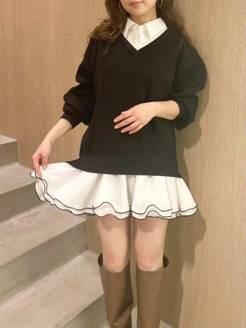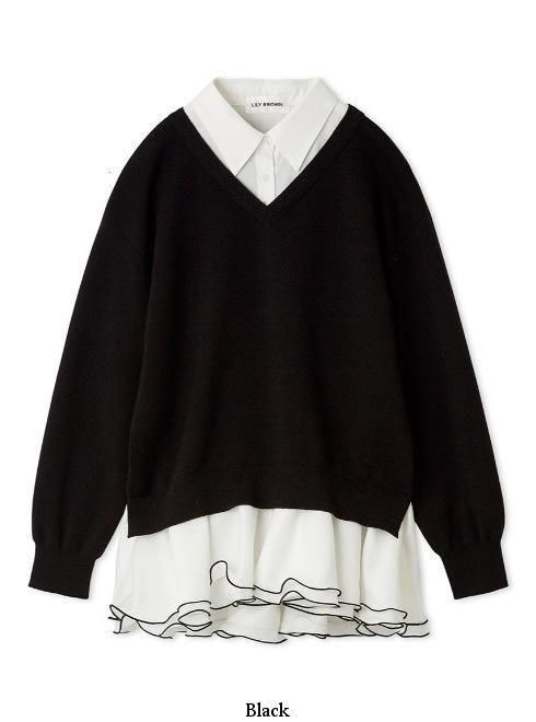 ニットプルオーバーとシャツワンピースをレイヤードしたようなデザインが目を引く一着。立体的なニットから覗く、裾のボリュームフリルが華やかさをプラスし、モードとフェミニンを絶妙にミックスしたスタイルを演出します。