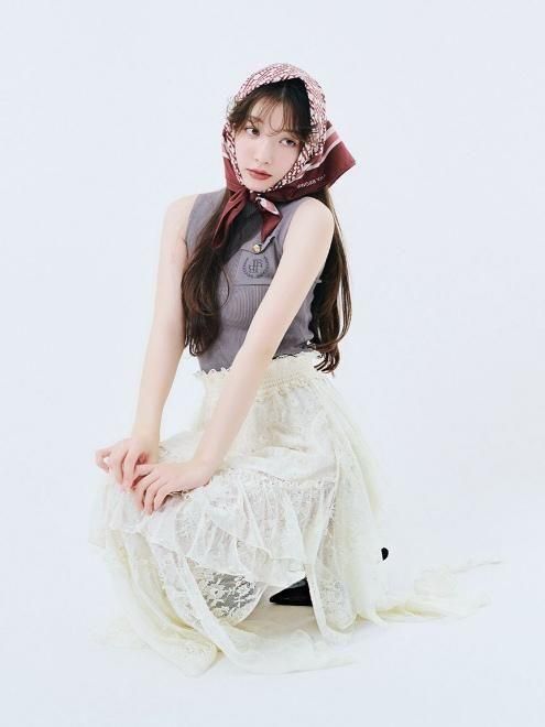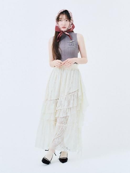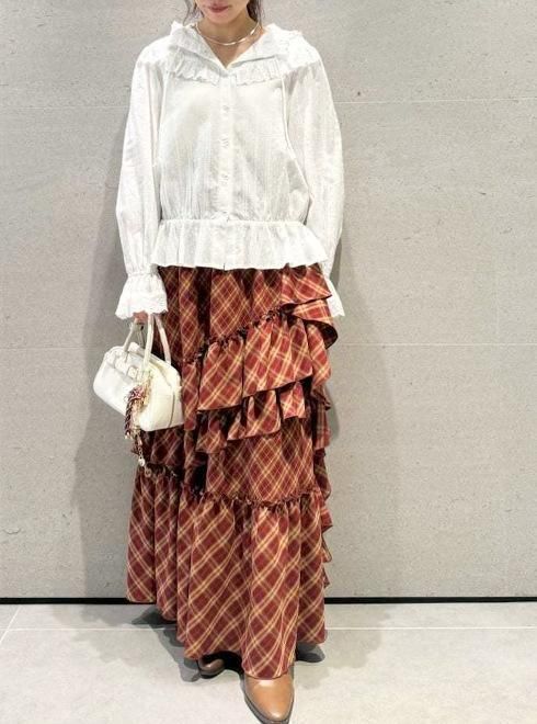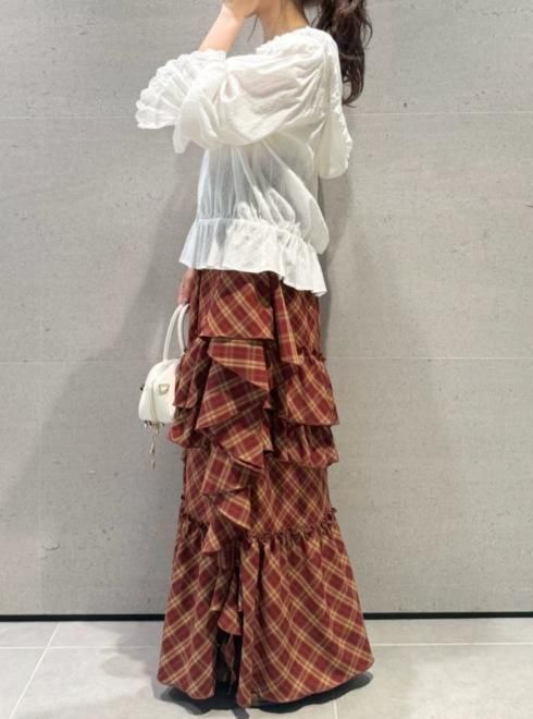フリルとラッフルを贅沢にあしらい、動きに表情を生むボリュームスカート。程よい落ち感のあるシルエットが広がりすぎず、甘さと洗練を絶妙なバランスで両立しています。